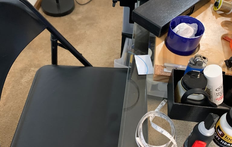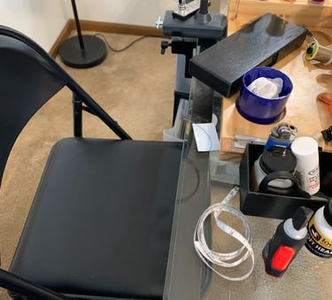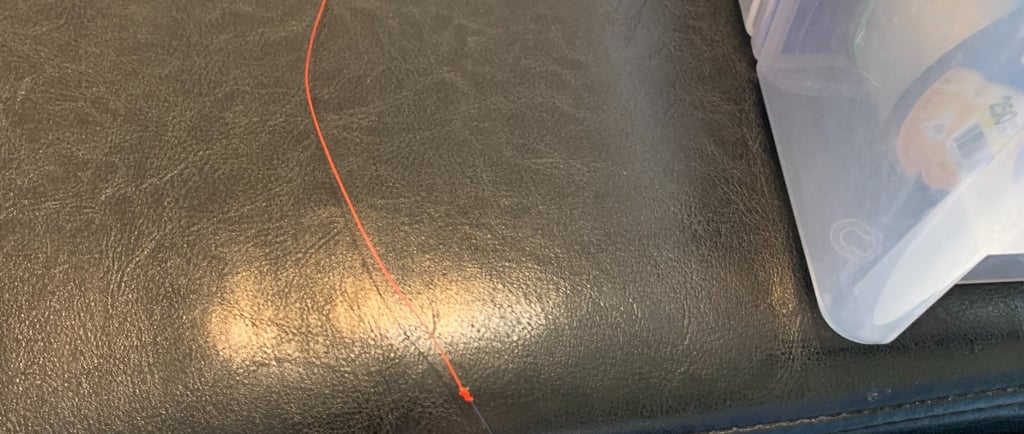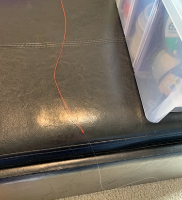 When I make leaders at home, it's a relaxing couch activity that may also include some extra steps for precision and durability. Unlike the hurried leader construction on the water, that may take only 10-15 minutes. The couch leaders can be works of art that take up to an hour, each. One of the durability steps added to the couch leader is touching all but the tippet knot with a micro-drop of super glue. Thus demanding that I lay these leaders out to be sure the glue sets, instead of immediately coiling and packaging them. No work bench, I'll lay one or two on the fly tying center chair and another few on the foot rest in front of the couch. And so I did, yesterday.