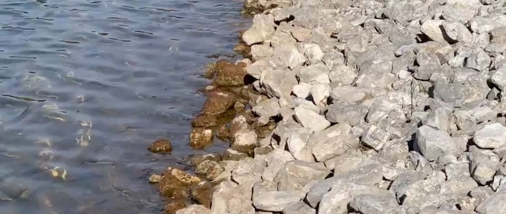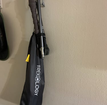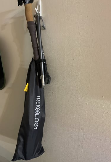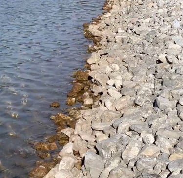 On Wednesday, I made my way to the 90 degree angle cut in the dike where trout had been consistently hanging out for ambushing prey. Fortunately, I could stay about 10 feet from the 90 degree drop and fish from the more accommodating 45 degree angled dike face. I'd periodically used a wading staff through the years, on those Ozark rivers. But duh it had never occurred to me after the rock dump on the dikes, that a wading staff could be used on dry ground, too. In fact, my "wading staffs" are actually hiking staffs that fold up, easily stow from my hip belt to behind my back, and have interchangeable tips for mud, snow, and hard surfaces. The soft rubber foot pictured here has so far, been awesome on these rocks. I'm zig zag moving like a lizard on the treacherous footing with my third leg, now!