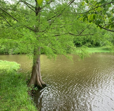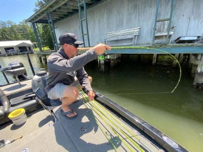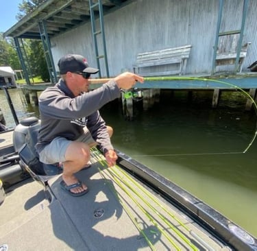 The fisherman's left hand is holding the jig head (or fly head if fly fishing-I used a fly jig so...best of both worlds). Requires some thought and finesse because you're fixing to shoot that jig AND HOOK out of your hand. Immediate propulsion that can bury a hook in flesh, if not thought out. (Practice is advised but I never practiced with a hookless jig or fly.) Note the fisherman pulling the jig and line back to form a bow in the rod. Look familiar? Like a bow and arrow? That's what it is. A good dock shooter can send a jig 50 feet just inches over the water, and under the platform of a dock to reach crappie chillin' in the shade toward the center of a dock. A good fly fisherman can send a fly (or fly jig/small streamer) at least 30 feet...inches over the water and under the tree branches. Or through a small opening in bushes in front of him. (Catch the fish-then figure out how you're going to land it.)