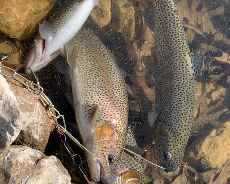 Experience had my feet carrying me to a place on the lake that fish seem to like-it's generally just small fish and not ultra-reliable. This area would at least give me a chance. Luck took me to a pile of trout, hanging out in the area for several reasons that I could assume. I caught three of the four trout ordered, "in record time". Leaving me to try and extend the fishing time to at least the amount of time the round trip to the lake, totaled! I released several trout larger than any on the stringer. Of course, in the fishing world that's always a curse. When I decided my time spent fishing was worth the drive, I had to settle for the trout smaller than any already on the stringer, to fill out the friend's order. Somewhere between that last fish and arriving home, I decided to return to the same lake next day, and simply release every catch.