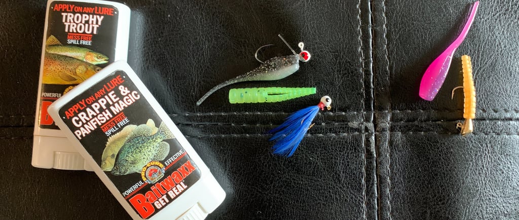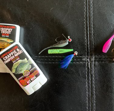 By default, my being lazy some days and not wanting to exert the effort to "scent" my lures as often as what may be necessary caused an untended and no effort piece of research developed and concluded. I was still catching the same number of fish without obsessing over "scent". I had scent for trout. Scent for panfish. Scent for bass. Sometimes leaving me to wonder, which fish talked of each of those species and revealed the recipe that would tempt them to sit at the table with me? Pictured at the heading is left over from when I thought scent may be a double digit percentage of catching fish. But here's where I'm at today. (And fishing is a fluid thing-no pun intended. Who knows where I'll be with fishing and scents a year from now. Who cares? (Not me.)) If you handle the gas pump on the way to your fishing hole, or you're wiping sweat on a hot day, or otherwise just massage a lure during the process of tying it on the line-ya better spray or wipe some scent. Regulations permitting. And I've no proof this is necessary! I just can't convince myself nor do I wish to waste the time determining that petro or human chemicals do repel fish. Or not. Today, I'm fine with wiping trout wax on a crappie jig. Or crappie wax on a trout jig. Or bass wax on either. Just cover your or Phillips 66 experience with a fishy scent.
