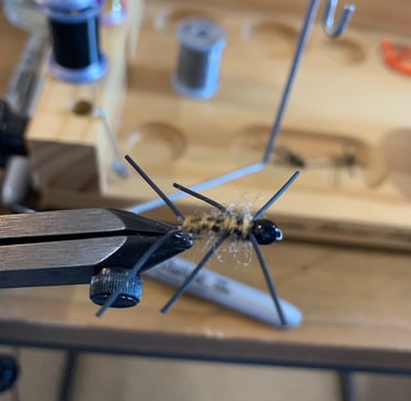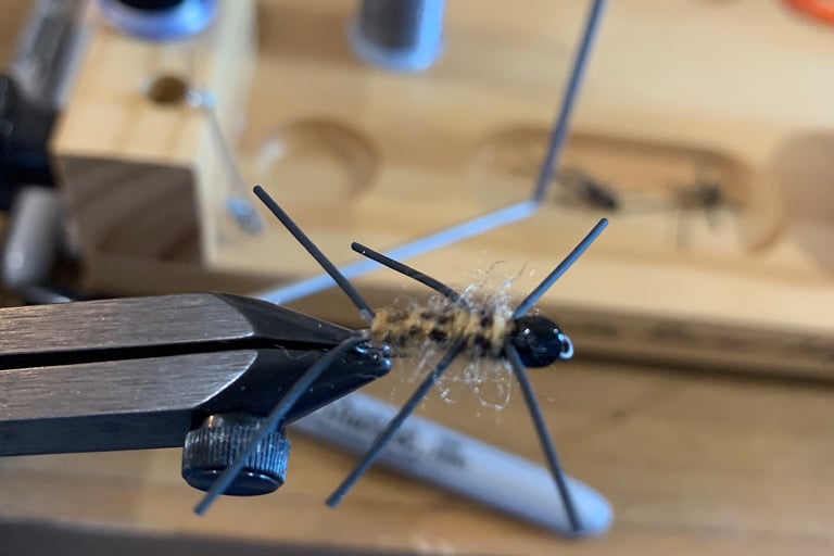 Your flies probably won’t be as appealing to the human eye as are the flies tied with what’s supposedly the correct materials. Here’s a Pat’s Rubber Legs I tied after it turned up multiple times during one day of watching YouTubers from Montana to a kid that “runs” the blue ribbon trout streams between Steelville and Springfield. Seems I could look away from the video but when my eyes returned, yet another trout was being shown just caught with a Pat’s Rubber Legs. Of course my first thought was, “I have a fly tying shop! 🫣 Find the materials in these boxes, and tie some Rubber Legs!”