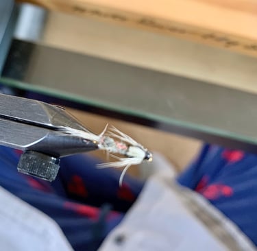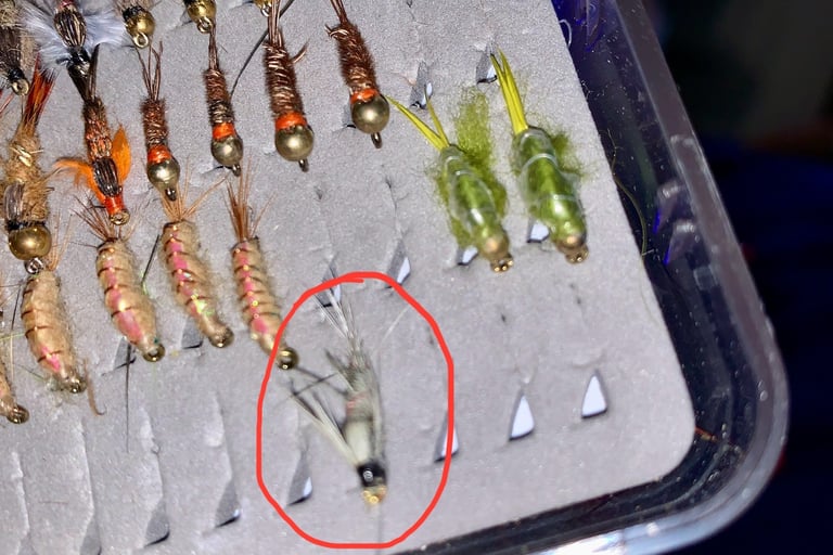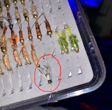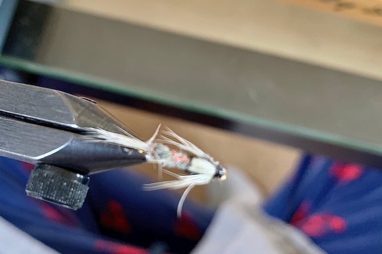 Not everything they were sipping on the surface survives-some number of whatever it was sinks for whatever reason. So now I was looking intently at what it was they were sipping. The only things I could see, plant matter or unidentified as to if it was insects, was white. So, after an hour and a half of trying to fish what I was comfortable with and no takers, I tied this on. Gray-always a good color, winged-I wasn't too sure any wings were popping out on anything yet in 50 degree water-but while it seems that fish can be terribly discriminating about what you're presenting to them, once you're in the zone anything close will work. For example, while I think the wings were a deal kiler, everything else about this little gray winged nymph was a deal maker. It was game on.