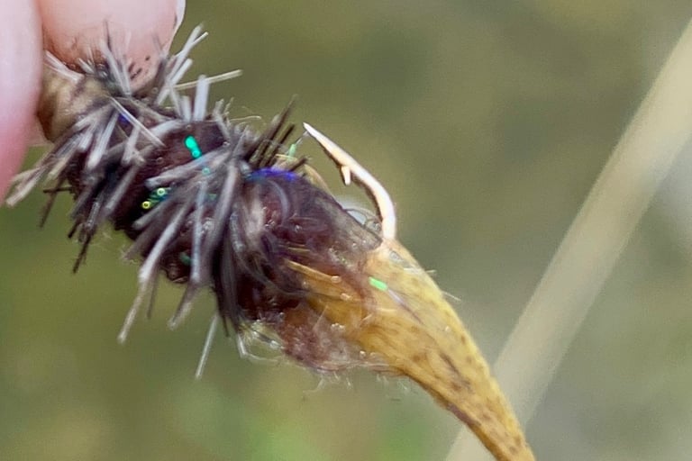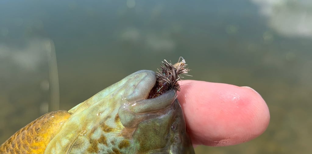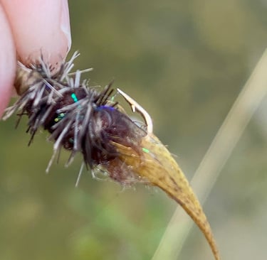 Throwing the ginger/flash fly jig again, I got into them at that "last spot". But noted about as many indicator jiggles as actual hookups. Feeling the need to make a change in the fly, I was cautious not to make a drastic change. Keep it near the same color, and go for the nymph that the late Charles Kraft said was good 12 months of the year. But this year, I began tying a hint of flash in it and I'll say, if a real nymph of the same class landed next to mine, I'd choose mine! (Which is how the tackle industry survives. Making lures that catch the fisherman and not necessarily the fish.) The CK nymph is simply yarn, grizzly hackle and wood duck feather. My touch is the flash. Thread is 140 UTC and I don't get too excited if I run out of a particular color. I have a couple dozen colors of Sharpies and simply pull thread off the bobbin, color it and rewind it. Kind of a poor man's fly tying process though in this case, it's more a lazy about shopping man's process.